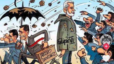 На опубликованном рисунке разгневанная толпа бросает комки грязи в сторону властей. Премьер-министр Испании Педро Санчес убегает под зонтом, в то…